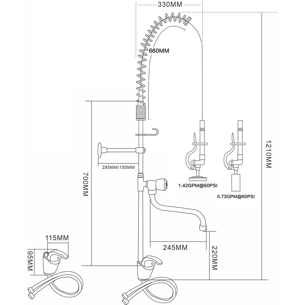 Professionaalne ja äärmiselt vastupidav eelloputamise pihusti, ideaalne toiduainete teeninduseks, kommertsköökideks, restoranideks ja hotelli rakendusteks. Seinale kinnitatav tüüp Kahekordne sisend (kuum ja külm vesi) Raskeveokite roostevabast terasest konstruktsioon