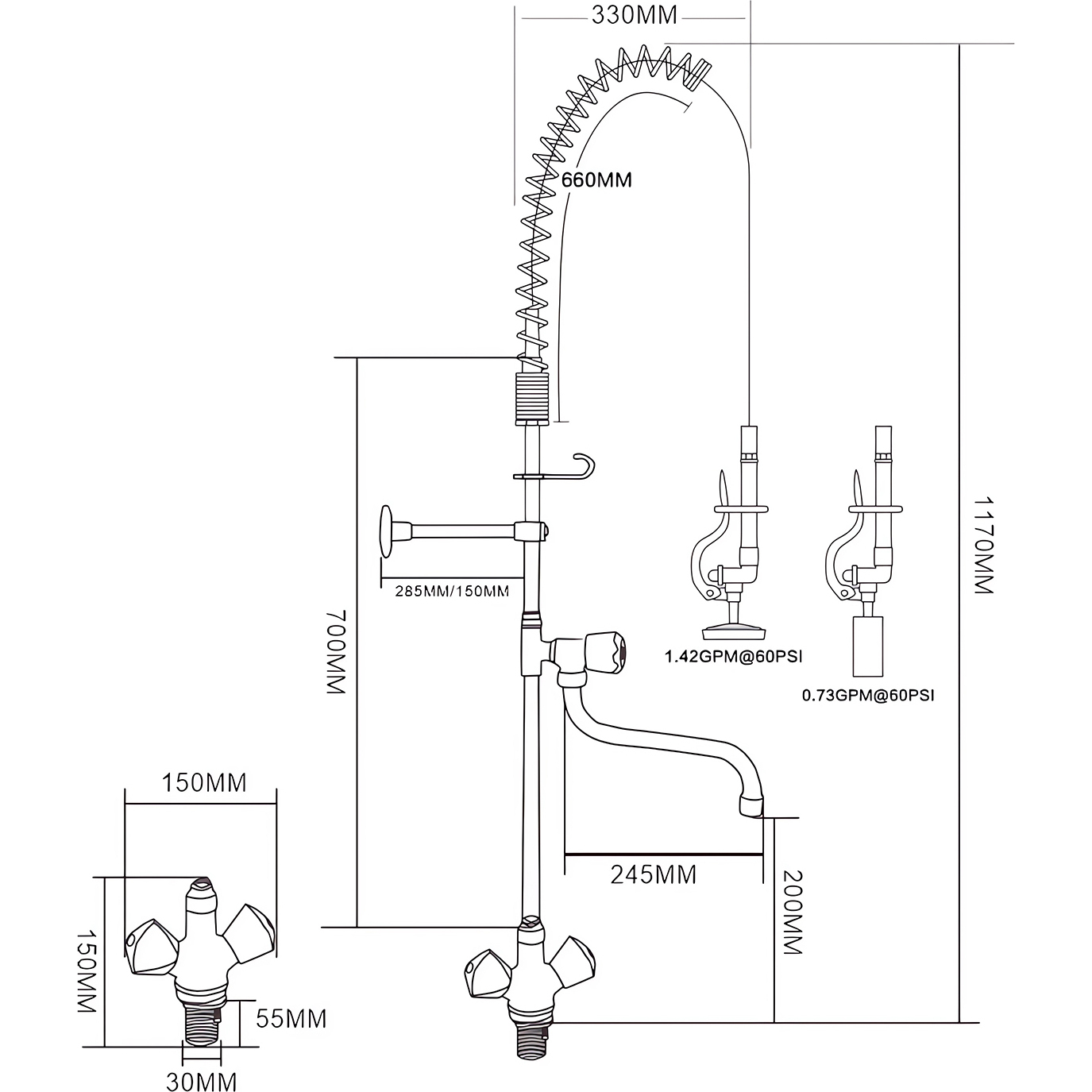 Professionaalne ja äärmiselt vastupidav eelloputusprits, mis on ideaalne toitlustusteenindusse, kaubandusköökidesse, restoranidesse ja hotelli rakendusteks. Seinale paigaldatav tüüpKahekordne sisselaskeava (kuum ja külm vesi)Raskekaaluline roostevabast terasest konstruktsioon