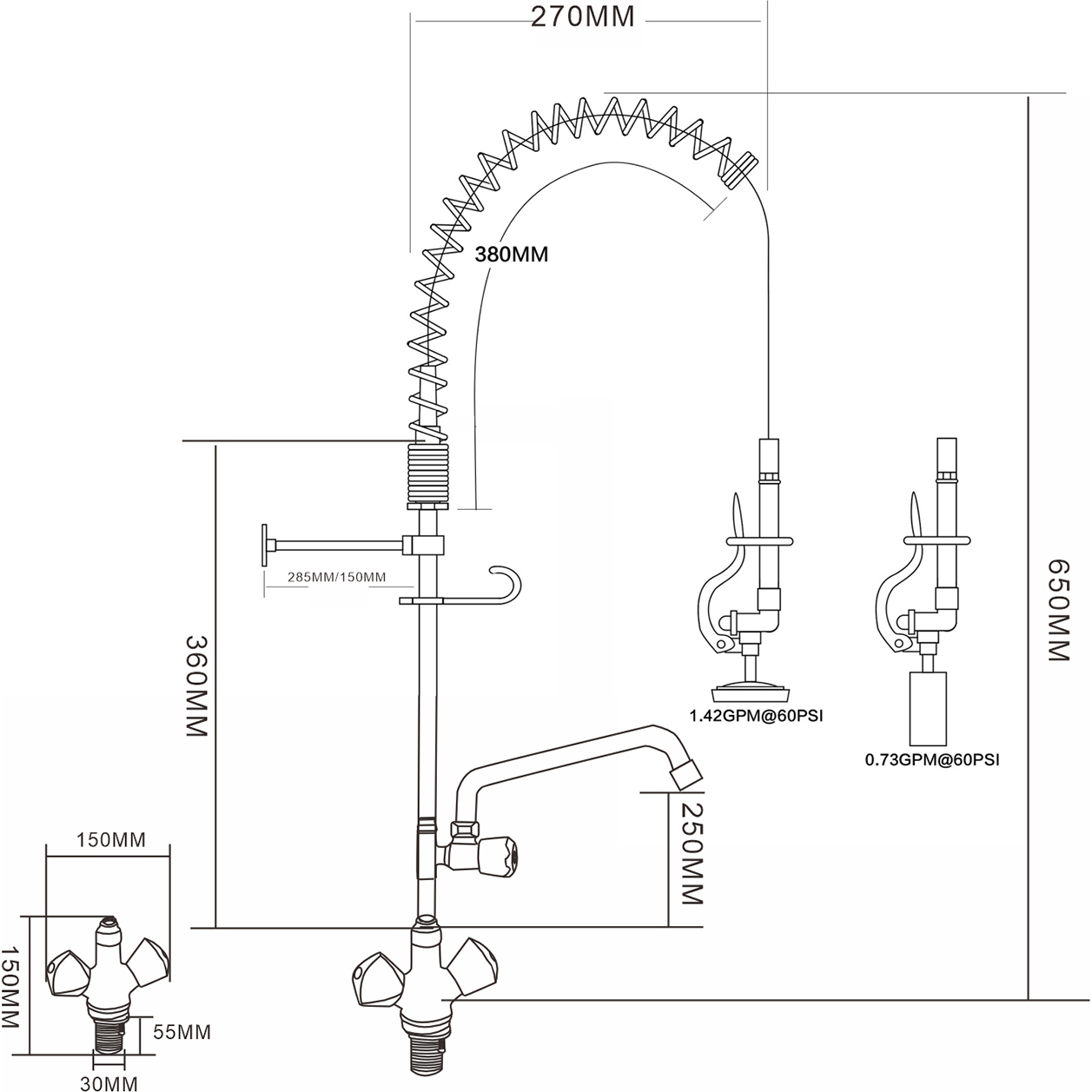 Professionaalne ja äärmiselt vastupidav eelloputusprits, mis on ideaalne toitlustusasutustele, kaubanduslikele köökidele, restoranidele ja hotellikasutuseks. Seinale kinnitatav tüüpTopeltühendus (kuuma ja külma vee jaoks)Tugev roostevabast terasest konstruktsioon