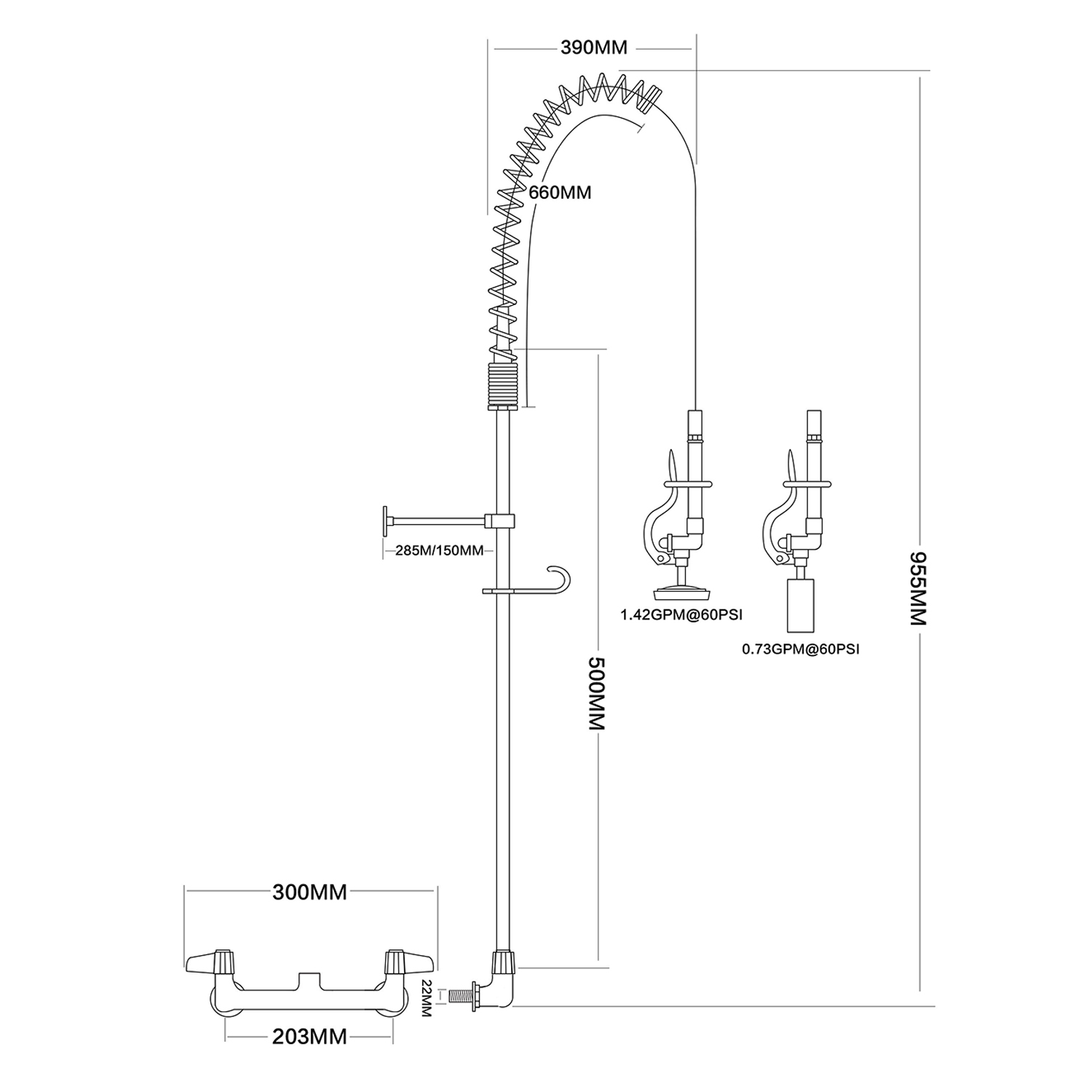 Professionaalne ja äärmiselt vastupidav eelloputusspreikomplekt, mis on ideaalne toiduainete töötlemiseks, kommertsiaalsetesse köökidesse, restoranidesse ja hotellidesse. Seinale kinnitatav tüüp Kahe sisselaskeavaga (kuuma ja külma veega) Raskeveokite roostevabast terasest konstruktsioon