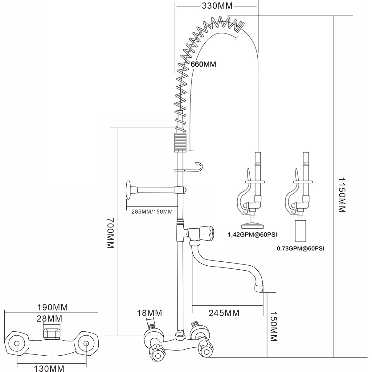 Professionaalne ja äärmiselt vastupidav eelpesuprits, mis on ideaalne toitlustusteenuse, kommertsköökide, restoranide ja hotellide jaoks. Seinapaigaldusega tüüp, kahekordne sisselaskeava (kuum ja külm vesi), vastupidav roostevabast terasest konstruktsioon.