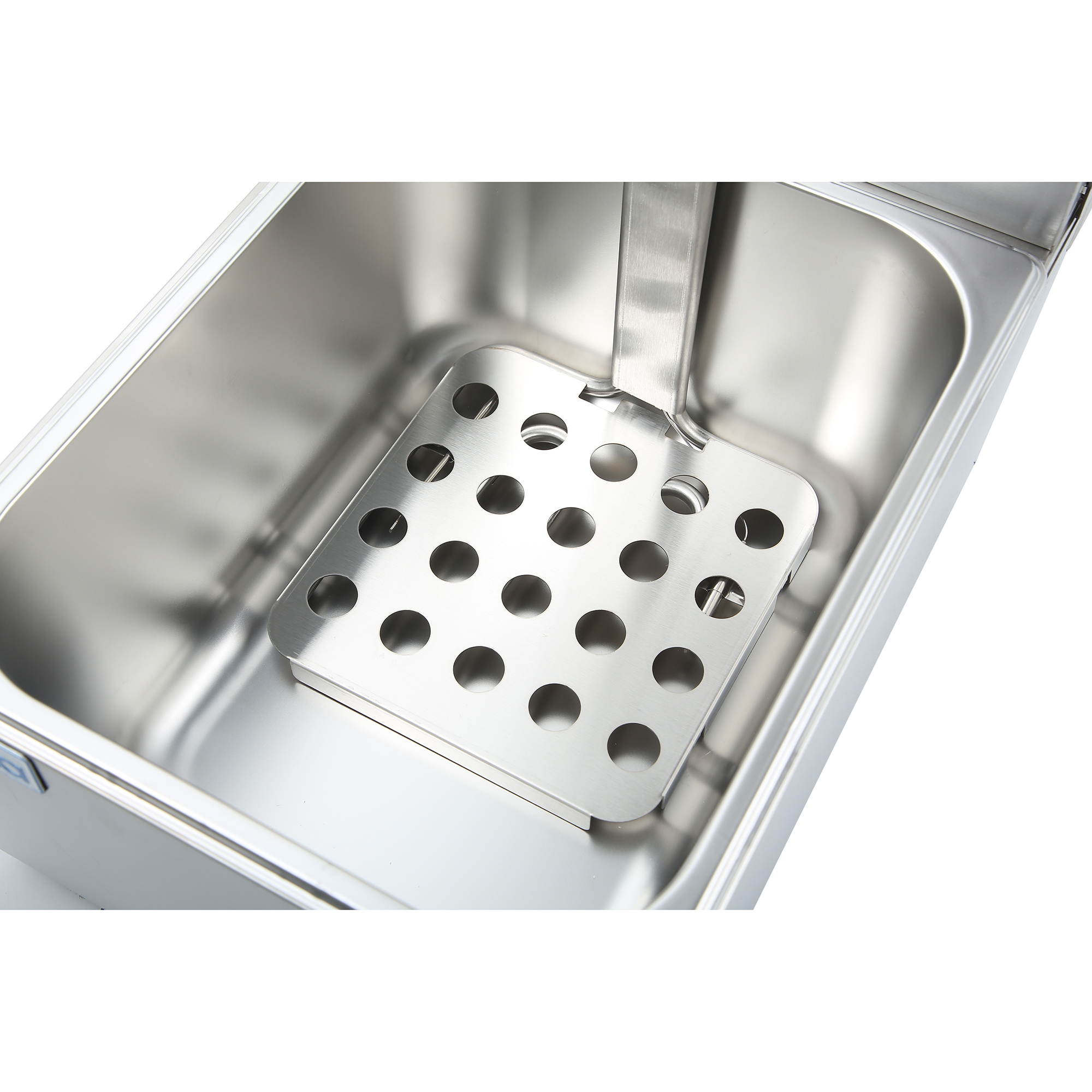 Suurepärase kvaliteediga ühepaagiline professionaalne elektrifritüür. Äärmiselt ruumisäästlik oma 285 mm laiusega, kuid suure mahutavusega 6 liitrine paak. Ideaalne varustus suure toodanguga kiirtoidukohtadele, on see asendamatu igas restoranis, kohvikus, kaasaostukohas või sööklas. Praegu suured allahindlused selle soodushinnaga. 6 liitrit 2500W +50°c kuni +190°c 285x450x310mm Üks paak Palun vaadake jaotist ‘Specifications’ üksikasjaliku teabe jaoks.