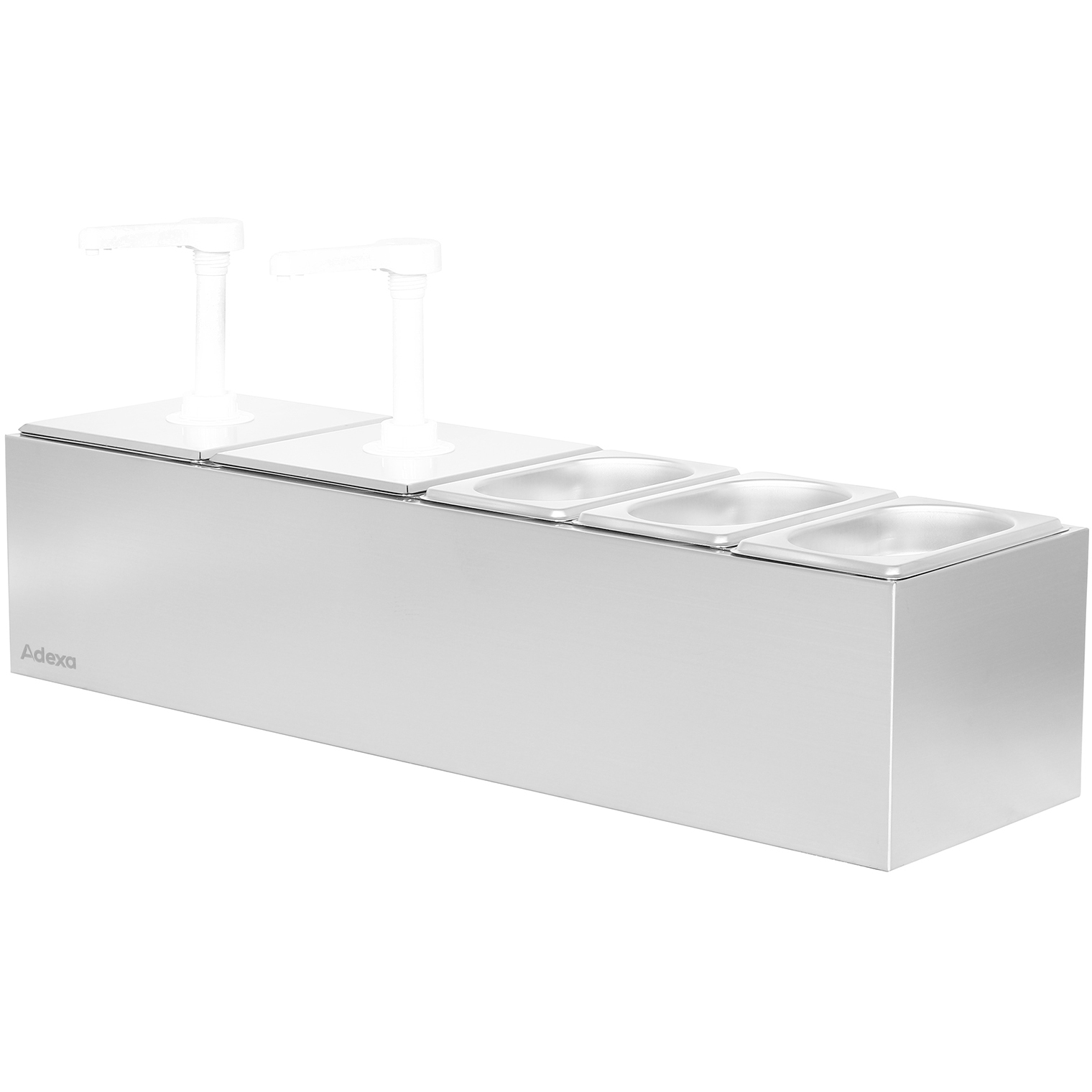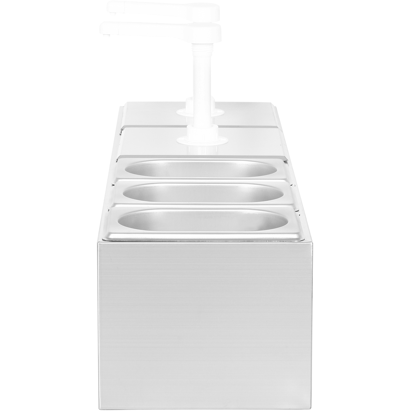 Hoia oma maitseained korras, kergesti leitavad ja ligipääsetavad selle roostevabast terasest maitseainebaariga! See maitseainebaar sisaldab 2 dosaatorpumpa vedelate maitseainete jaoks, samal ajal kui nende vahel olev üksik anum mahutab kuni 1,1 liitrit tahkeid maitseaineid. Roostevabast terasest korpus tagab suurepärase vastupidavuse ja temperatuuri säilitamise, et su jääkotid püsiksid võimalikult kaua jahedad. Tänu lihtsasti kasutatavatele plastpumpadele saad vähendada raisatud toote kogust, kui kliendid kasutavad maitseaineid.