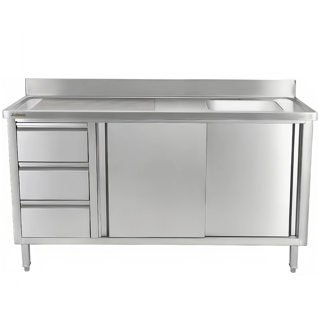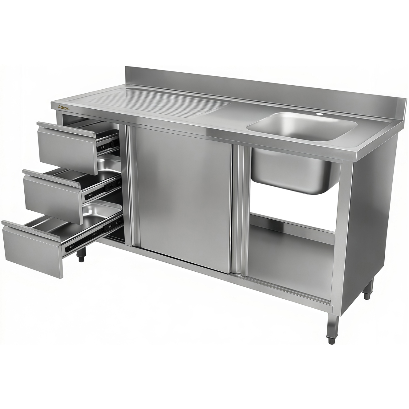 Kaubanduslik roostevabast terasest valamu kapp 1400x600x900mm 1 kauss paremal 3 sahtlit pritsmekaitsega | Adexa DSA601402D3DR