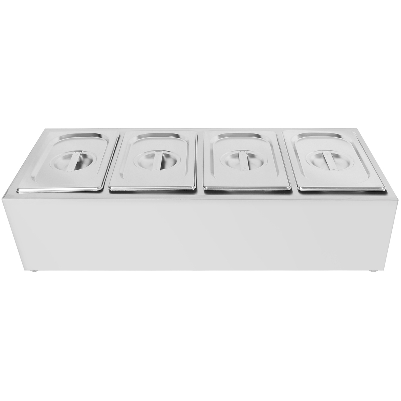See maitseaine hoidik on ideaalne toidu esitamiseks buffet’il või toidu ettevalmistamiseks köögi ettevalmistusalal. Valmistatud tugevast roostevabast terasest, on konteinerite hoidik väga vastupidav ja kauakestev, võimaldades tal taluda aastaid intensiivset kasutamist ning seega vähendades vajadust asenduste ostmiseks. Sile roostevaba teras on samuti väga lihtne puhastada. sisaldab 4xGN1/4-100mm.
