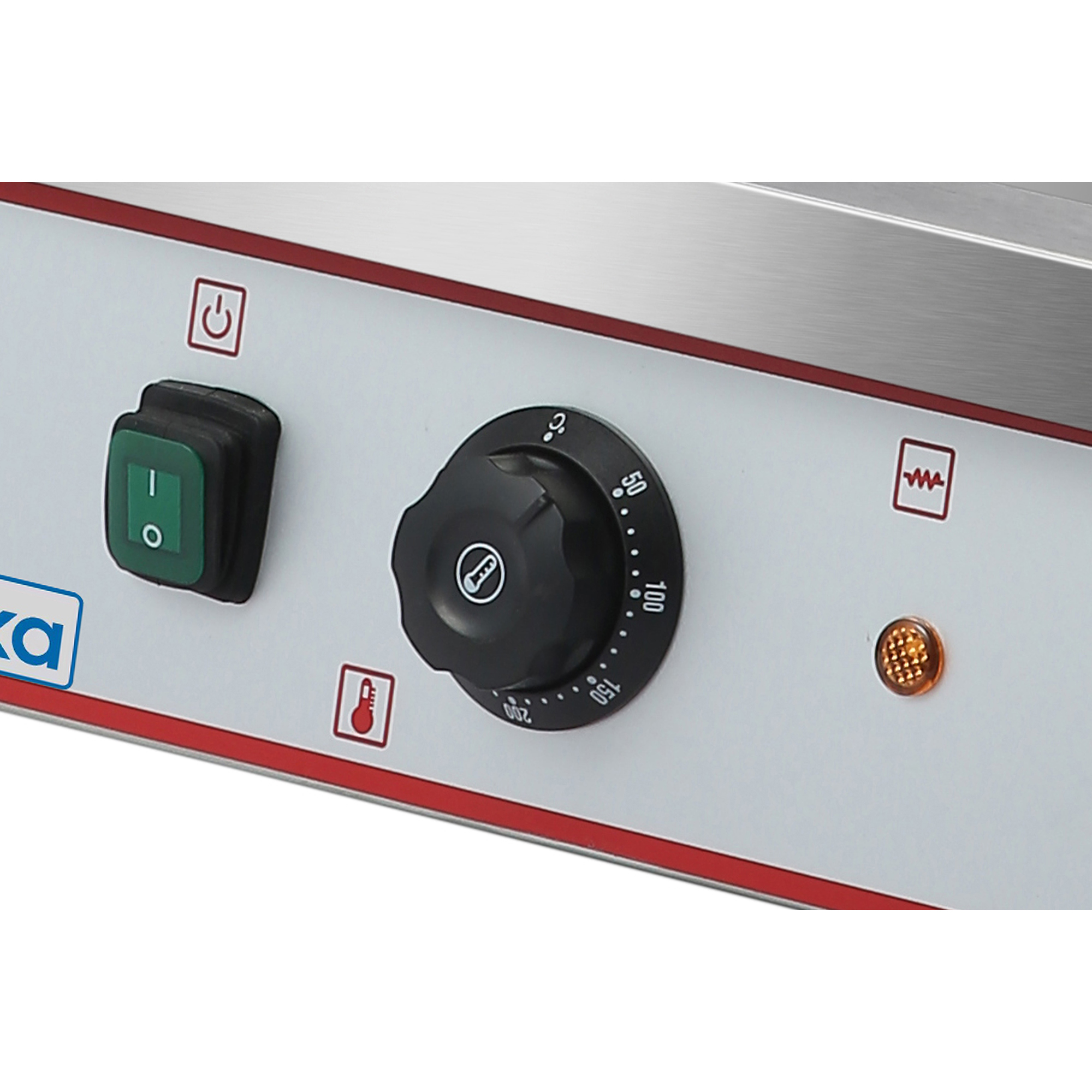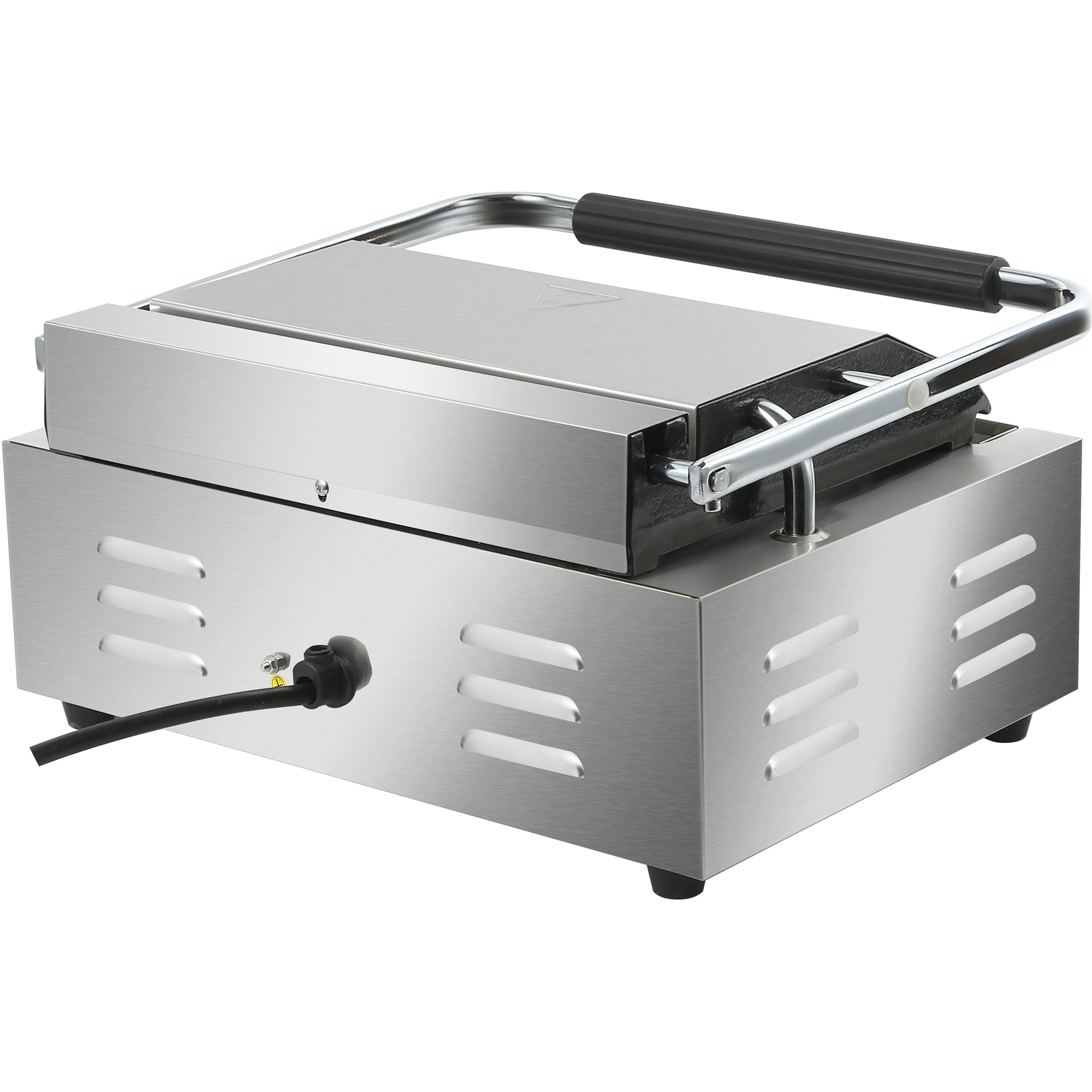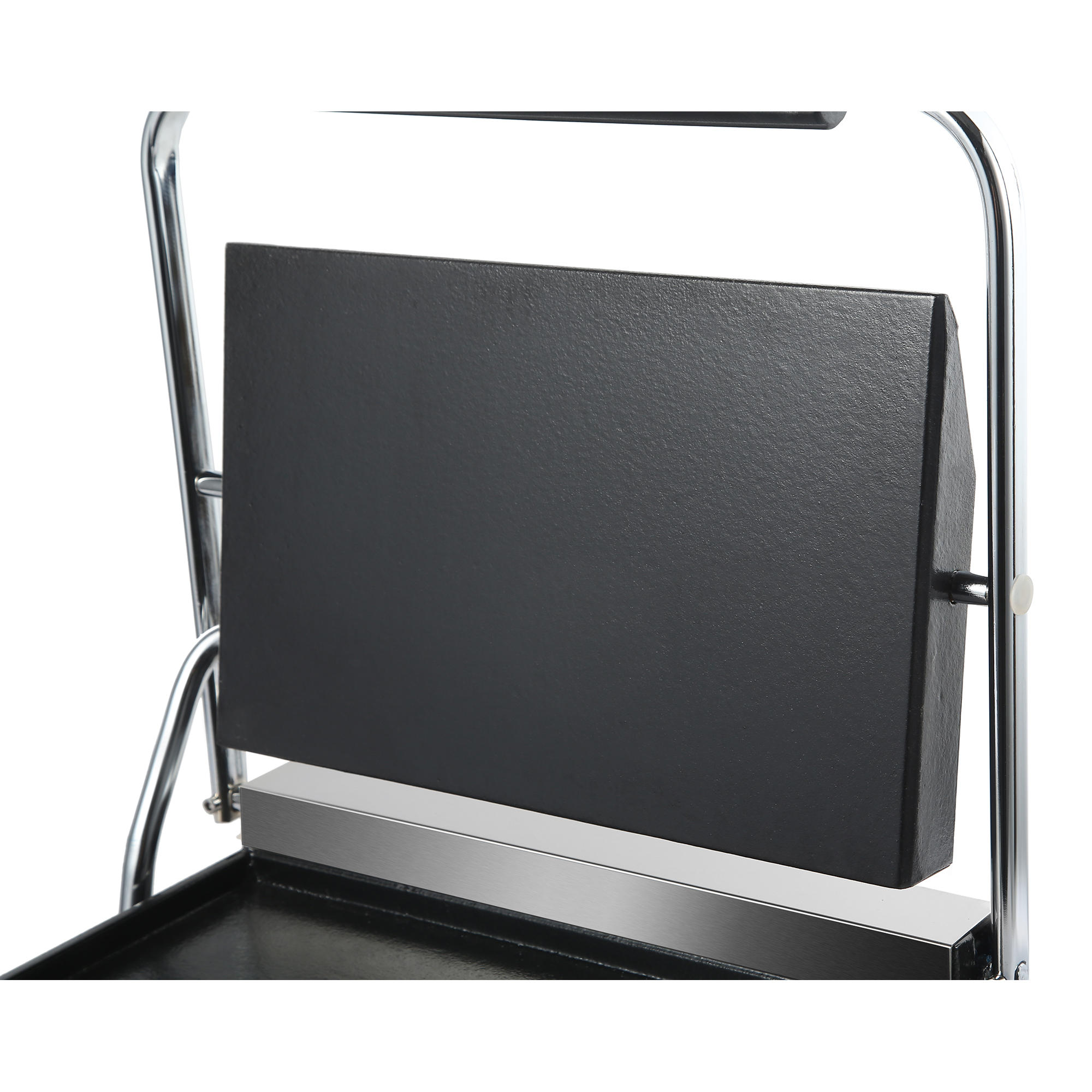 Valmista oma populaarseimad võileivad täiuslikult selle multifunktsionaalse panini võileivagrilliga! See grill on varustatud malmist plaatidega, et küpsetada võileivad ühtlaselt. Termostaatilised juhtimisseadmed võimaldavad teil temperatuuri reguleerida, et saada ideaalne küpsetamistemperatuur, samal ajal kui roostevabast terasest välisraam tagab pikaajalise vastupidavuse. Suurepärane paninide, võileibade, leiva ja isegi hamburgerite ning quesadillade grillimiseks, see mitmekülgne grill lisab teie ettevõttele mitmekesisust! Roostevabast terasest korpus Malmist küpsetuspind +50°C kuni +300°C